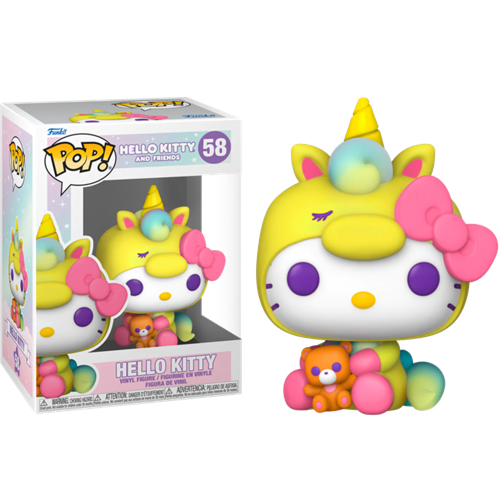 Tu es invité à la soirée pyjama d'Hello Kitty ! Vêtue d'un pyjama licorne coloré avec son nœud rose caractéristique, Hello Kitty est prête à faire la fête avec style et confort. Elle tient dans ses bras un petit ours en peluche dans une pose assise, ce qui lui donne un air très confortable.